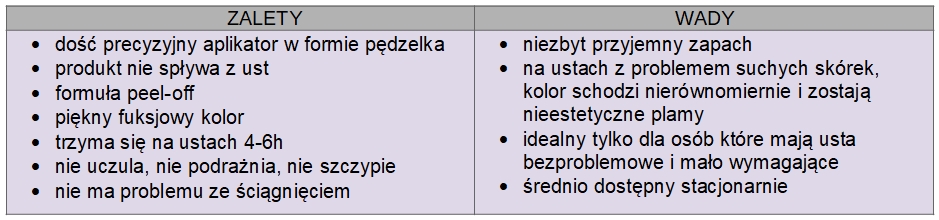 Jak już wspomniałam wcześniej aplikujemy go pędzelkiem. Ja osobiście nie miałam większych problemów z nadaniem kształtu moim ustom i uważam że aplikator jest wystarczająco precyzyjny, żeby nie zrobić sobie większej krzywdy. Co dalej? Tint zastyga całkiem szybko, tworząc na naszych ustach cienką warstwę koloryzującą o formule peel-off. Nie ma większych trudności z jej ściągnięciem, można nawet powiedzieć, że schodzi całkowicie przy pierwszym podejściu. Oczywiście otrzymany kolor najlepiej jest zabezpieczyć jakimś błyszczykiem, aby wytrzymał nam dłużej na ustach. Kiedy miałam go na ustach czułam delikatne mrowienie, jednak sam tint krzywdy mi nie zrobił. Nie uczulił mnie i nie podrażnił. Jednakże jest to produkt dla osób, które nie mają w ogóle problemu z przesuszaniem się ust i suchymi skórkami. Mimo iż moje usta były przygotowane do aplikacji, czyli zostały odpowiednio nawilżone, skórki zmiękczone i usunięte, to kiedy produkt tracił na kolorze i się zjadał, na ustach pozostawały nieestetyczne plamy koloru, które mocno się odznaczały. Wyglądało to tak, jakby pigment w miejscach gdzie wcześniejsze skórki zostały usunięte trzymał się mocniej, natomiast na nienaruszonej warstwie naskórka łapał słabiej, A to z kolei doprowadzało do nierównomiernego tracenia koloru. Dlatego też jest to produkt, który fantastycznie się sprawdzi u osób, których usta są mało wymagające w odniesieniu do ich pielęgnacji.